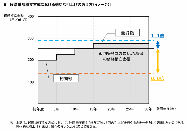 段階増額積立方式における月あたりの徴収金額は、均等積立方式とした場合の月あたりの金額を基準額とした場合、計画の初期額は基準額の0.6倍以上、計画の最終額は基準額の1.1倍以内とする。